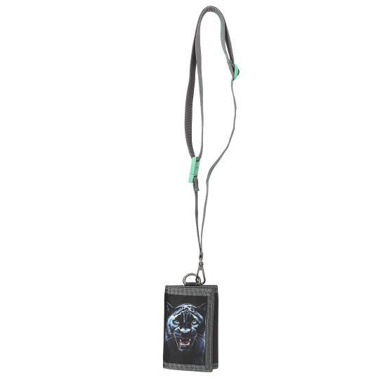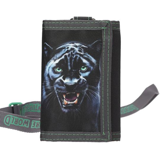 De kop van de zwarte panter die zijn tanden laat zien, lijkt wel uit de voorkant van de donkergrijze portemonnee te springen. Met groene details, een afneembare lange lanyard, een grote karabijnhaak voor sleutels, een ritsvak voor munten, een vak voor biljetten en diverse vakken voor pasjes, inclusief een vak met een transparant venster. Van Adventure World. Materiaal: 100 procent polyester.