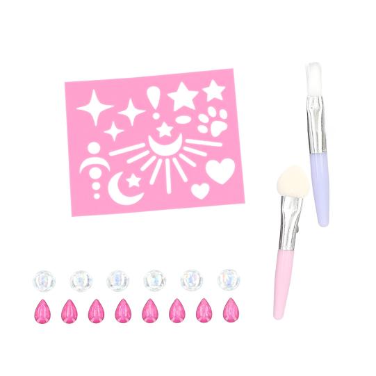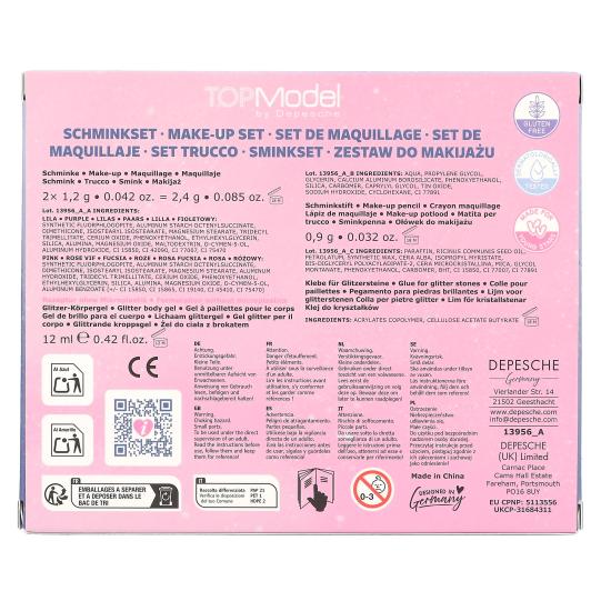 De TOPModel make-up set met magisch glinsterende sterren, manen en schattige dierenpootjes bevat 1 paars make-up potlood (0,9 g), 1 zilverwitte bodyglittergel (12 ml), paarse en roze make-up in een klein potje (2,4 g), 14 mooie decoratieve stickers voor op de huid en 2 kwasten.